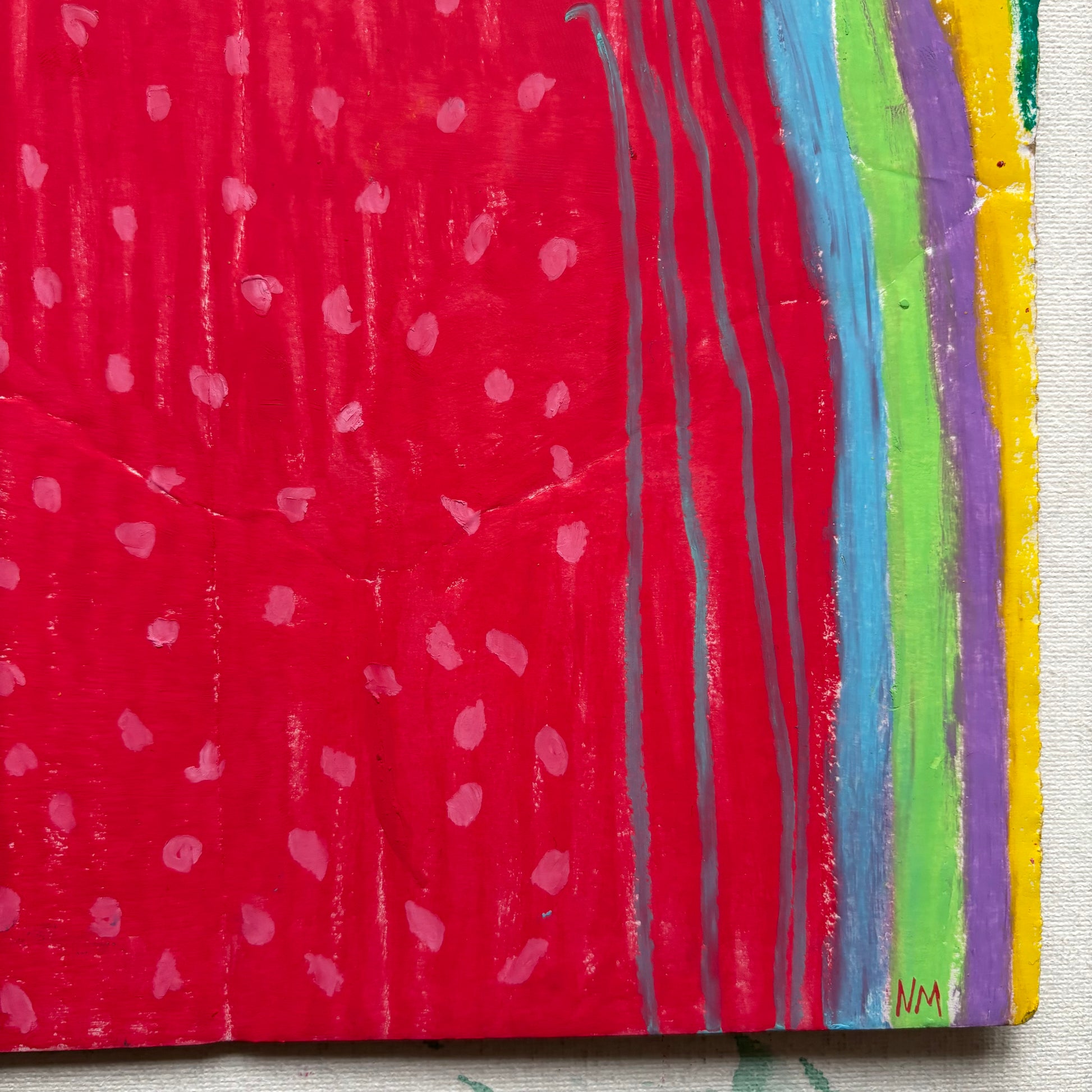 I love to paint on bits of cardboard, recycled into little paintings. The cardboard has bits of wear and tear, giving an imperfect texture to the painting.